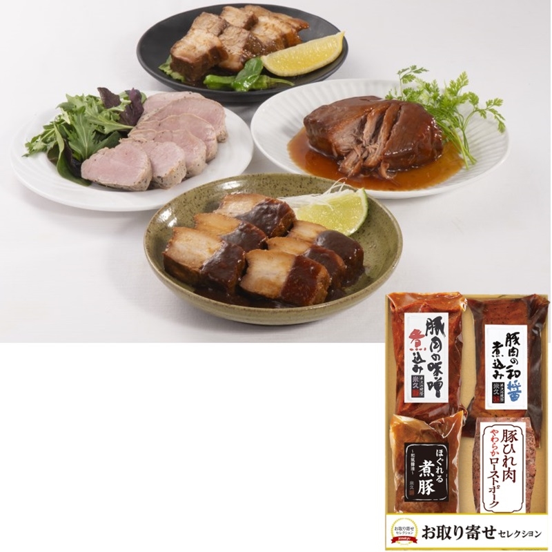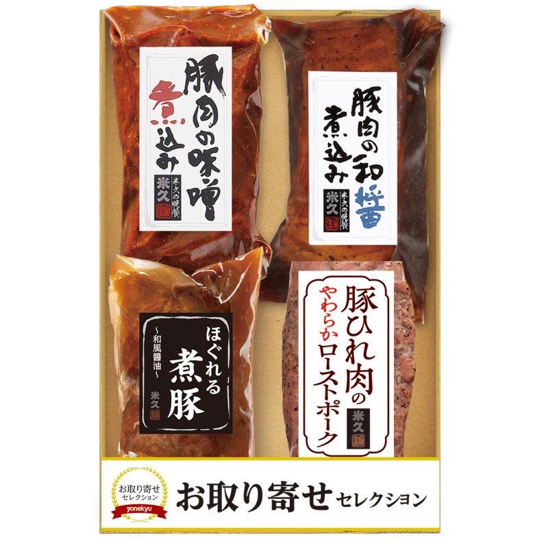 - 豚肉の味噌煮込み210g、豚ひれ肉のやわらかローストポーク100g、ほぐれる煮豚230g、豚肉の和醤煮込み210g