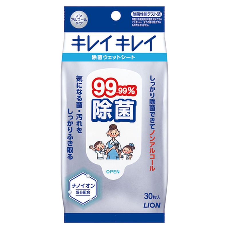 市場初ノンアルコールタイプで99.99%除菌できるウェットシートです。