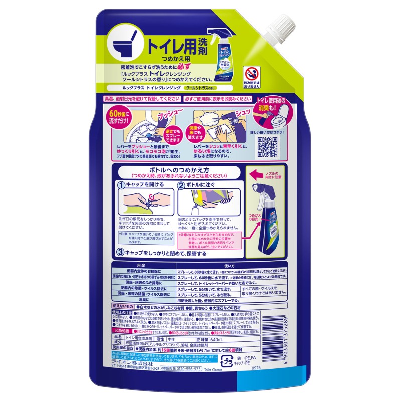 ●密着泡でこすらず洗うために必ず「ルックプラス トイレクレンジング クールシトラスの香り」につめかえてください。