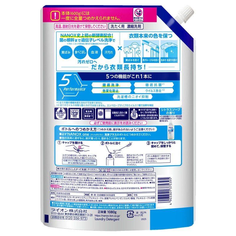 ●衣類長持ち処方…徹底洗浄、徹底抗菌(※1)、色変化防止、ウイルス除去(※2)、洗濯槽のニオイ抑制。