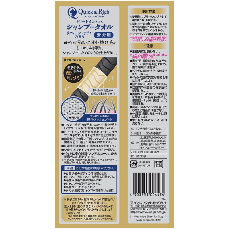 トリートメント成分が被毛の1本1本をコート。1枚でボディの汚れ・ニオイ・抜け毛をしっかりふき取ります。