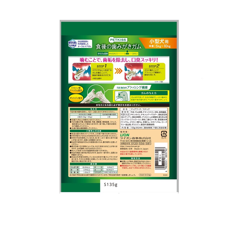 当社獣医師と共同開発した歯みがきガム。当社独自のブラッシング繊維のガムをギザギザねじり形状に。