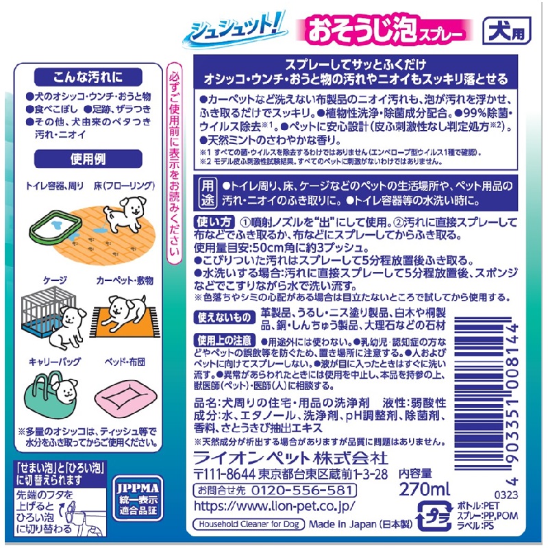 オシッコ・ウンチ・おうと物の汚れやニオイもスッキリ落とせる。植物性洗浄・除菌成分配合。