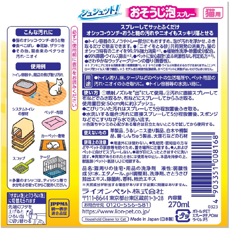 オシッコ・ウンチ・おうと物の汚れやニオイもスツキリ落とせる。トイレ容器のスノコやトレ一部分 にも。