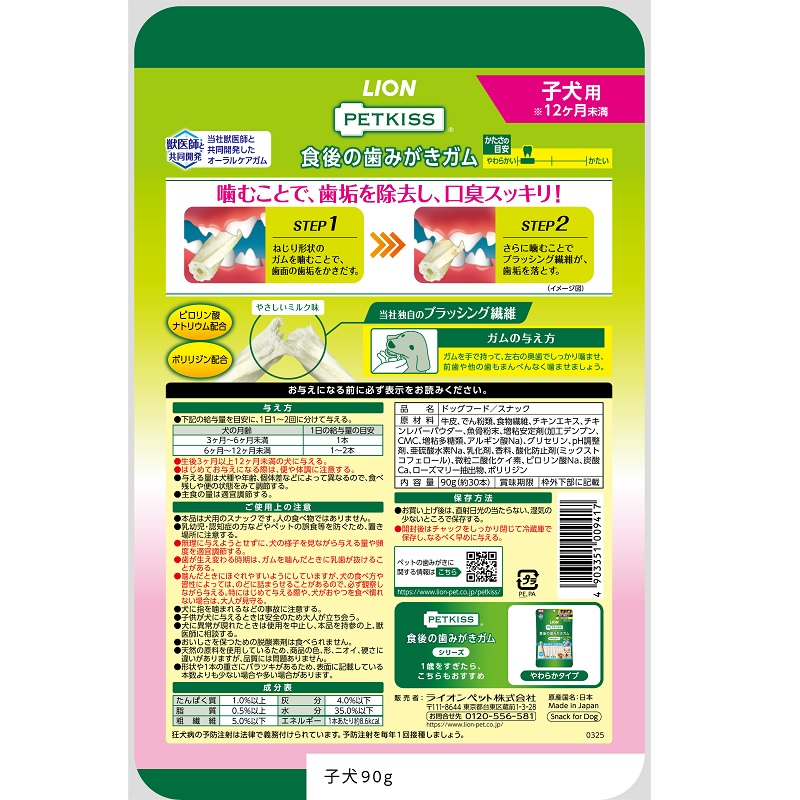 当社獣医師と共同開発した歯みがきガム。やわらかく細いガムを束ねたロープ状ガム。