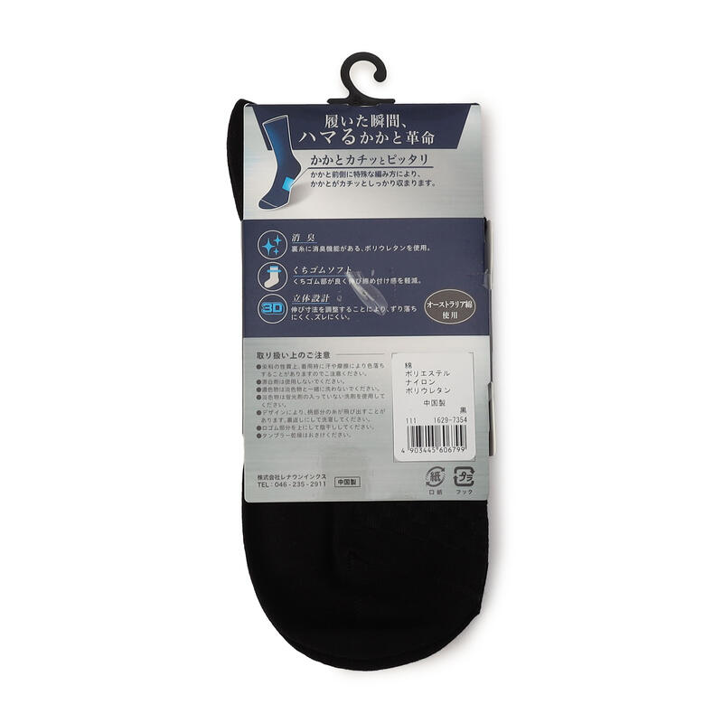 かかと前に特殊編地を入れる事により履いた瞬間、かかとカチッとピッタリ。