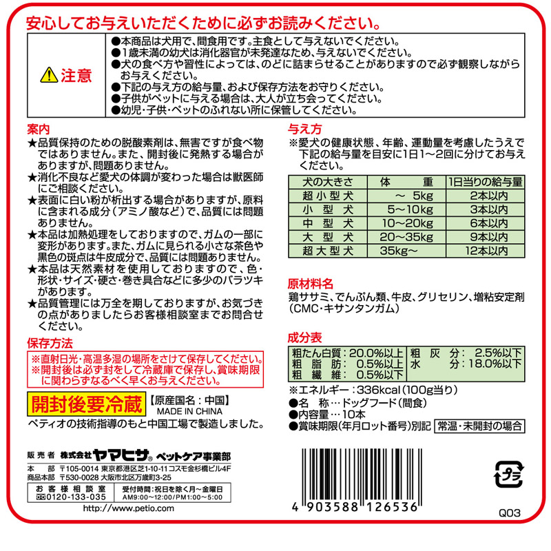 低脂肪・高たんぱくな鶏ササミを、噛みごたえ抜群の棒ガムに巻きました。