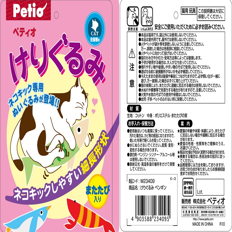 ネコキックしやすい細長形状です。またたび入りなのでネコちゃん大興奮!