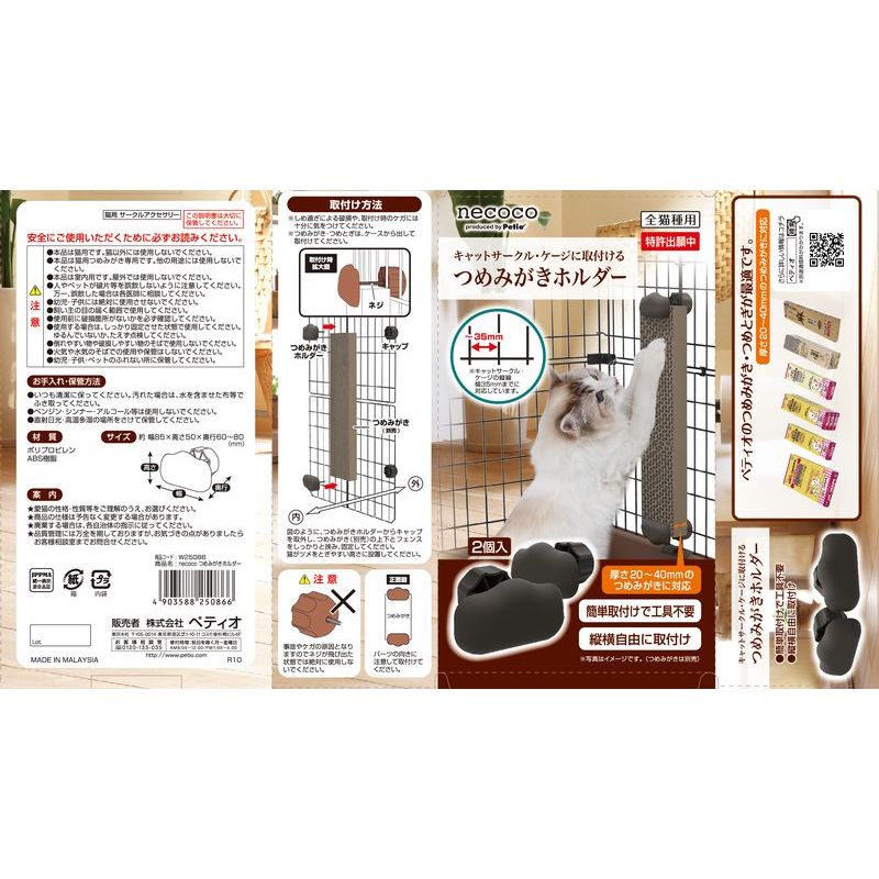 つめみがきをキャットサークルやケージに縦横自由に、簡単に取付けることができます。工具不要。