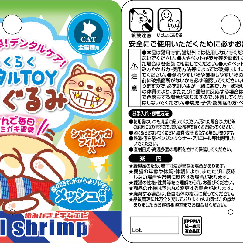 遊びながらハミガキ習慣!ネコちゃんのためのデンタルTOY。噛んで歯の汚れがからまりやすいメッシュ仕様のぬいぐるみ。