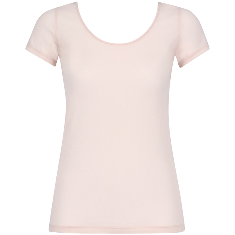 アウターになじみのよいカラーと、襟ぐりの細ステッチ仕上げは下着感が少なく、首もとからチラリと見えてもOK。