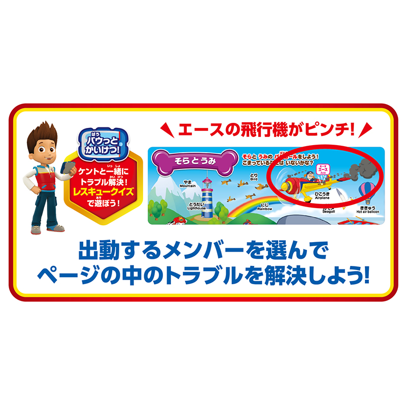 ページの中でトラブルが起きているよ!ケントの声を聞いて、出動するメンバーを探してタッチしよう!正しいメンバーを選ぶことが