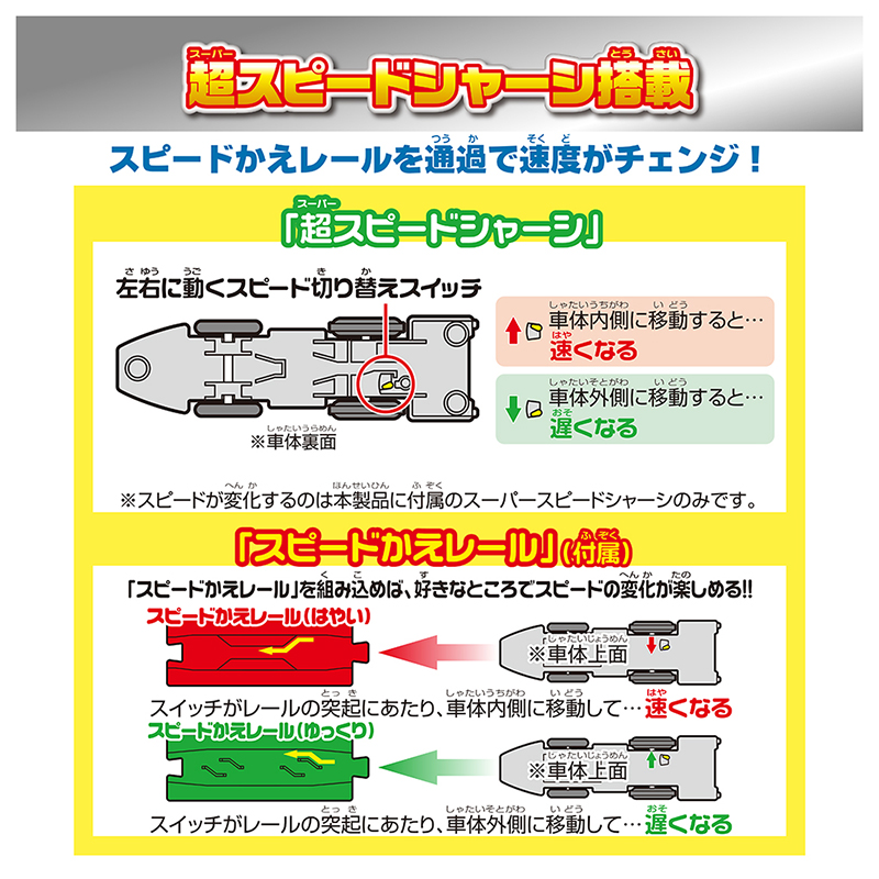 赤のレールを通過すると【はやく】緑のレールを通過すると【ゆっくり】に速度変化する。