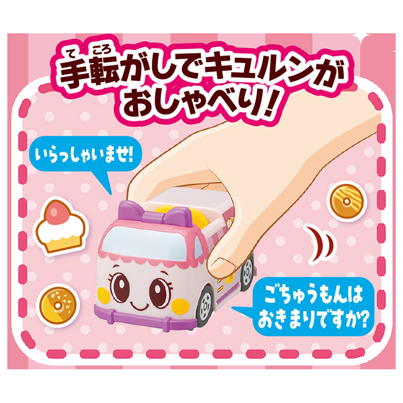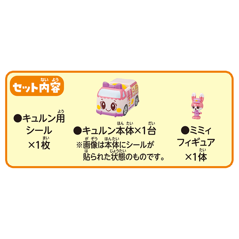キュルン(ビークル)本体の電源をONにし、手転がし遊びをするとキュルンの音声が流れます。また付属のミミィのフィギュアをキ