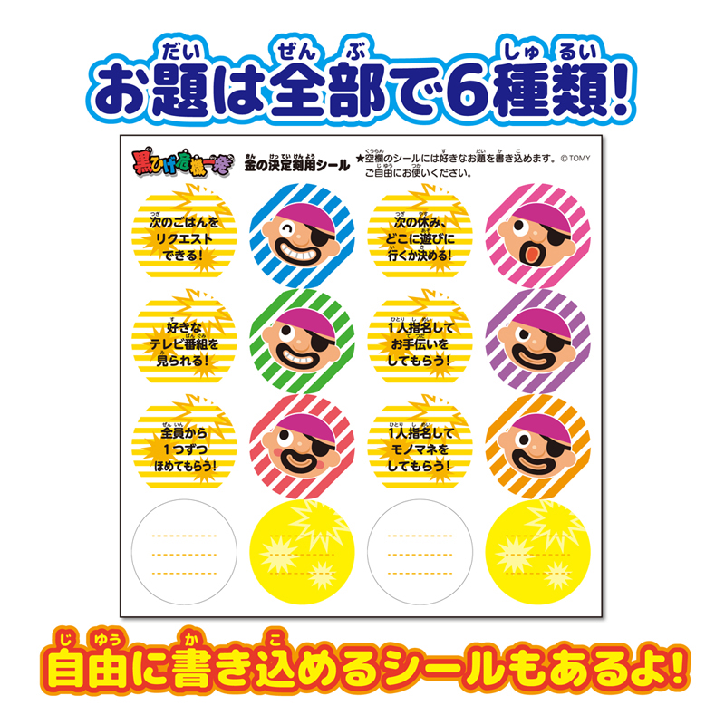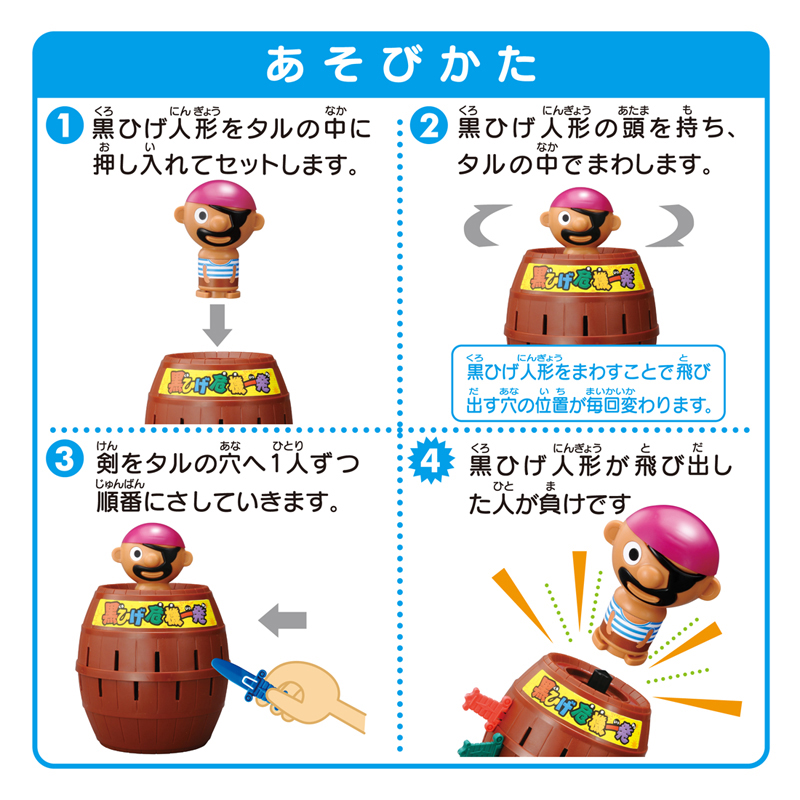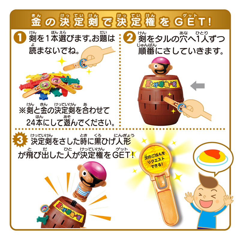 などのお題が設定され、それぞれの剣で黒ひげを飛ばしたプレイヤーがお題に沿った「決定権」を争奪するという遊びが楽しめます。