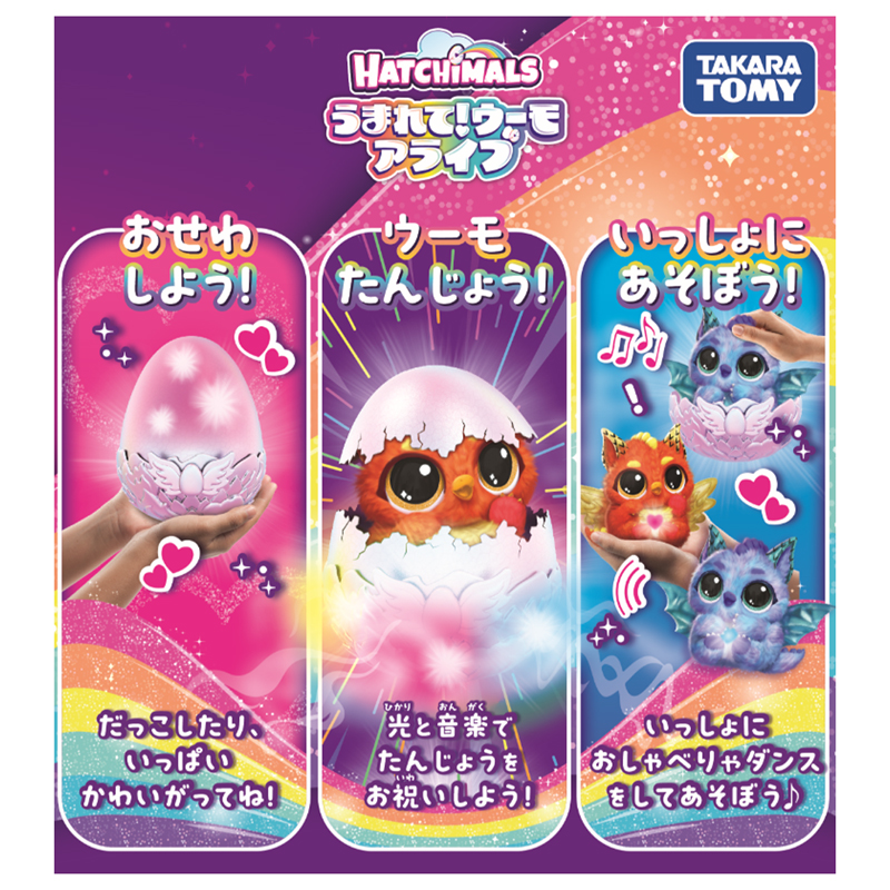 たまごが虹色に光ったら、ウーモが中から殻をつつき始めて生まれてくるよ。