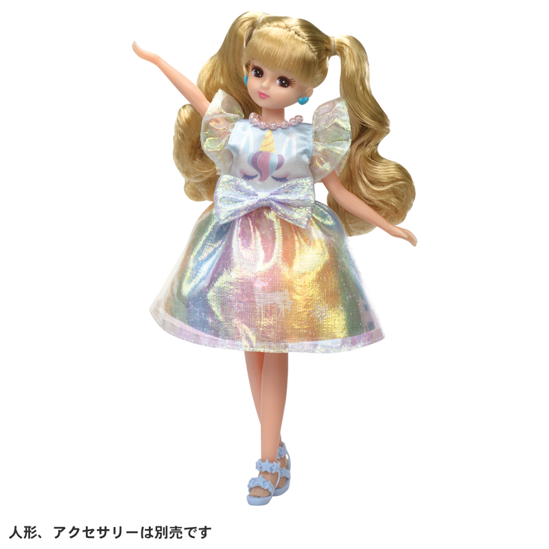 ホログラムのオーバースカートに虹色のスカート、胸にはゆめみるユニコーンプリント、星のサンダル付きです
