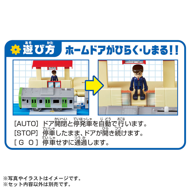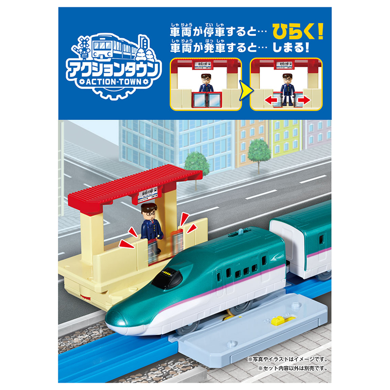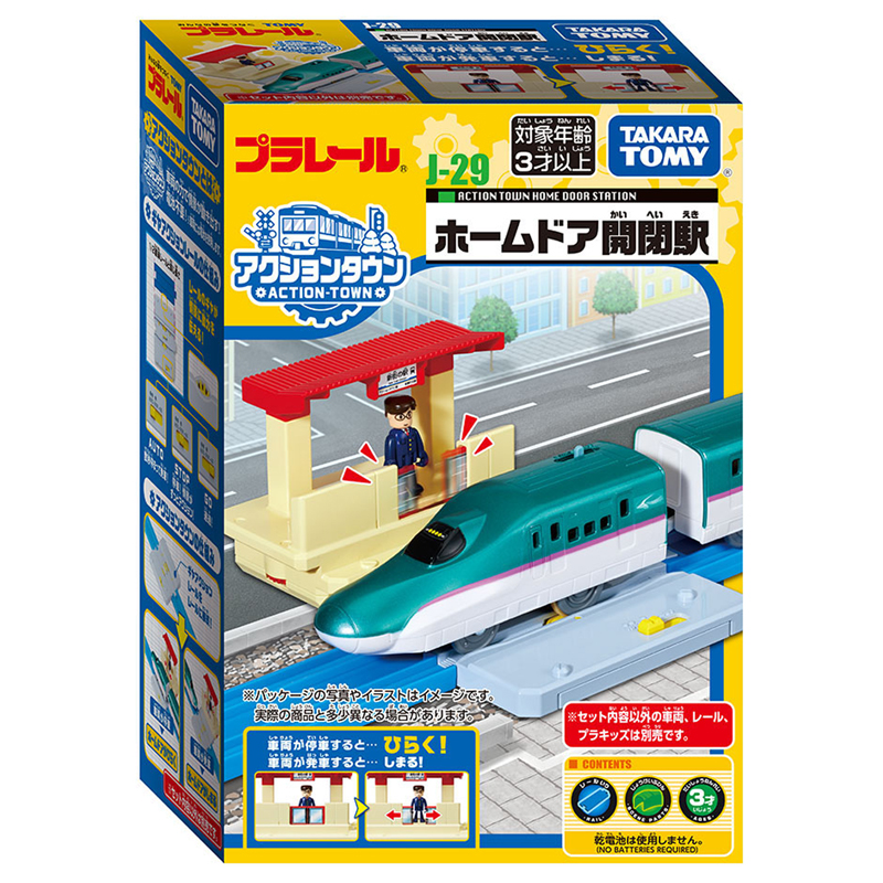 ■別売の「J-30 アクションタウン プラキッズ改札駅」とつなげることができ、車両が停車すると2つのアクションを一緒に遊