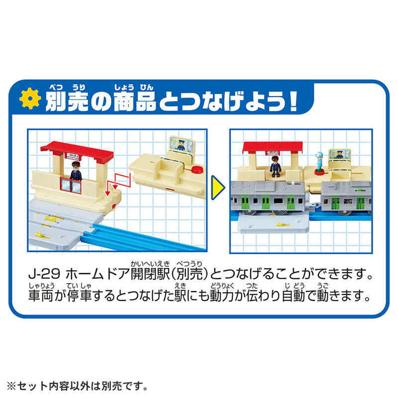 ■別売の「J-29 アクションタウン ホームドア開閉駅」とつなげることができ、車両が停車すると2つのアクションを一緒に遊