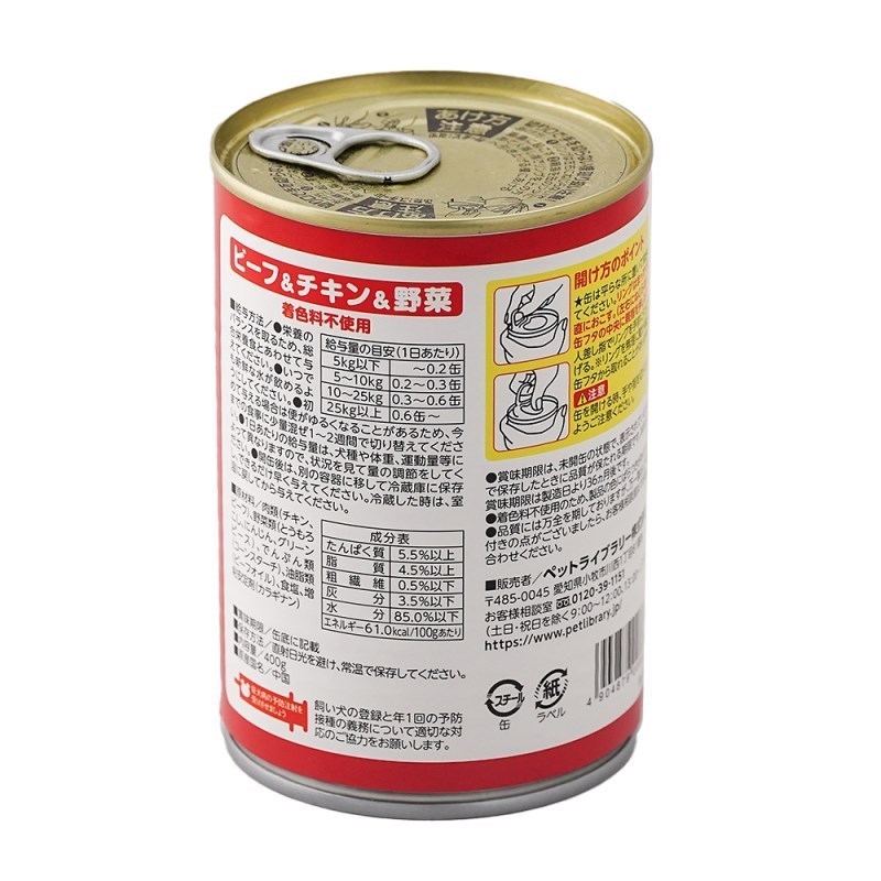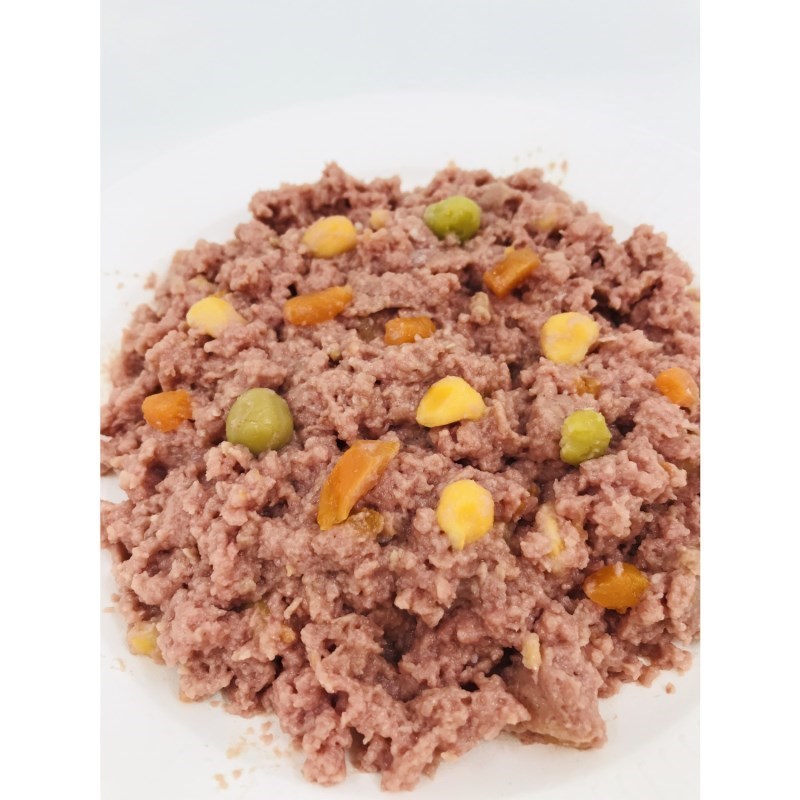 - 肉類(チキン、ビーフ)、野菜類(とうもろこし、にんじん、グリーンピース)、でんぷん類(コーンスターチ)、