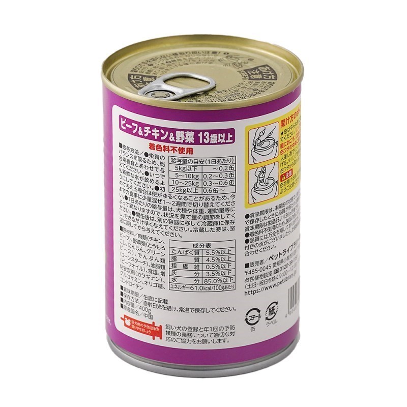 - 肉類(チキン、ビーフ)、野菜類(とうもろこし、にんじん、グリーンピース)、でんぷん類(コーンスターチ)、