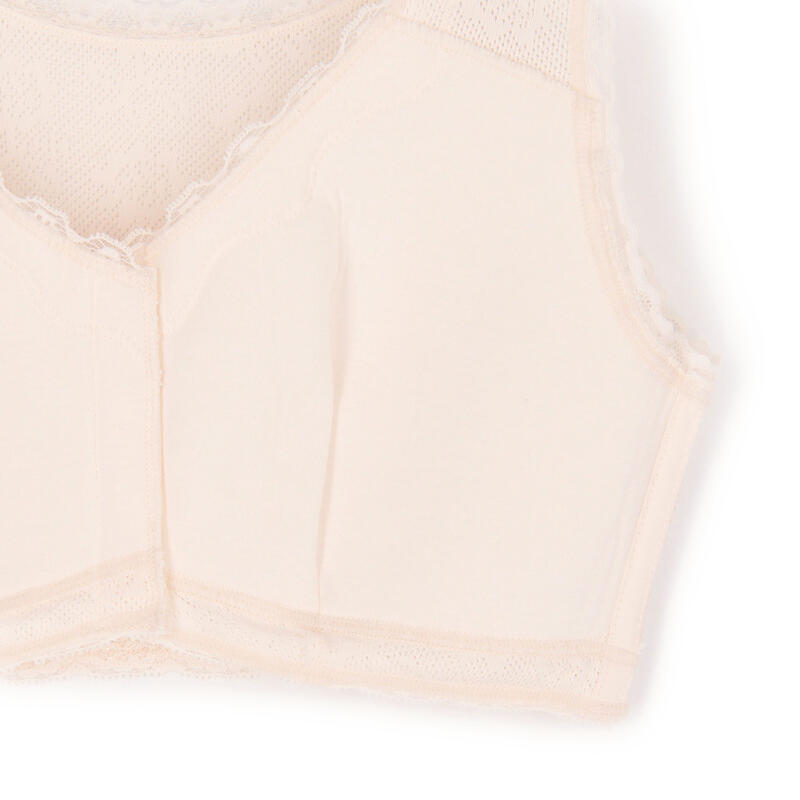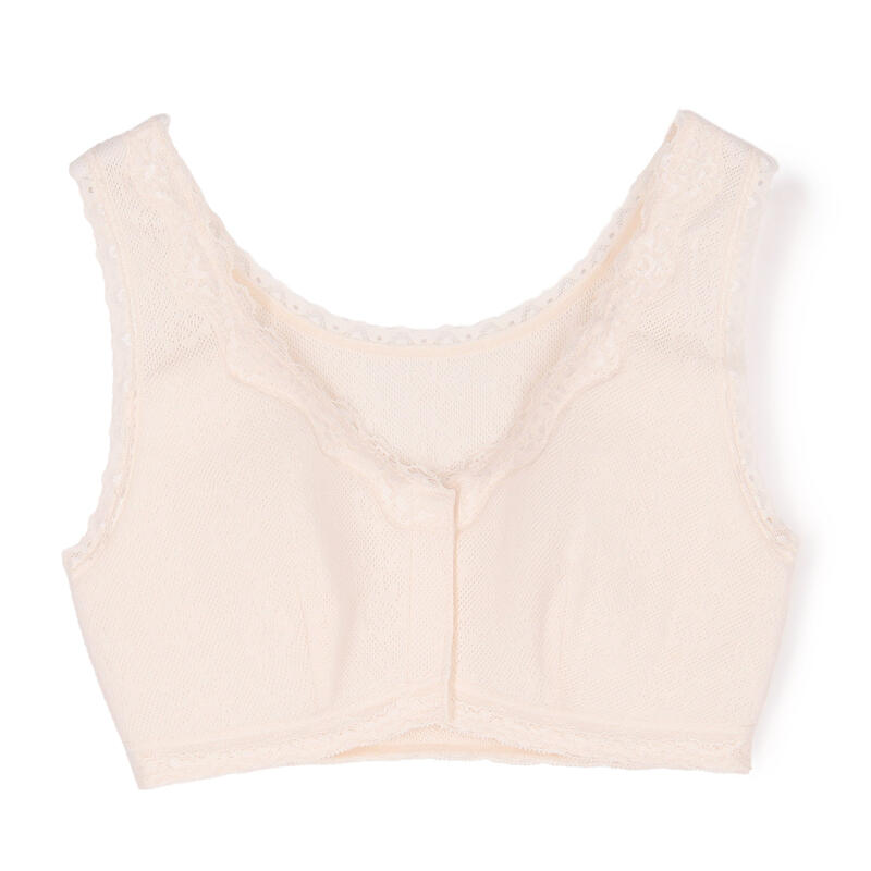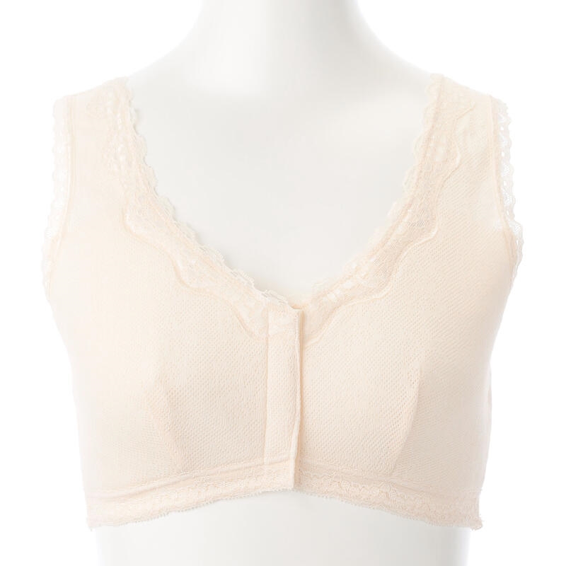 しめつけない楽な着心地のらくらくハーフトップブラジャー、前あき・ボタン付き。