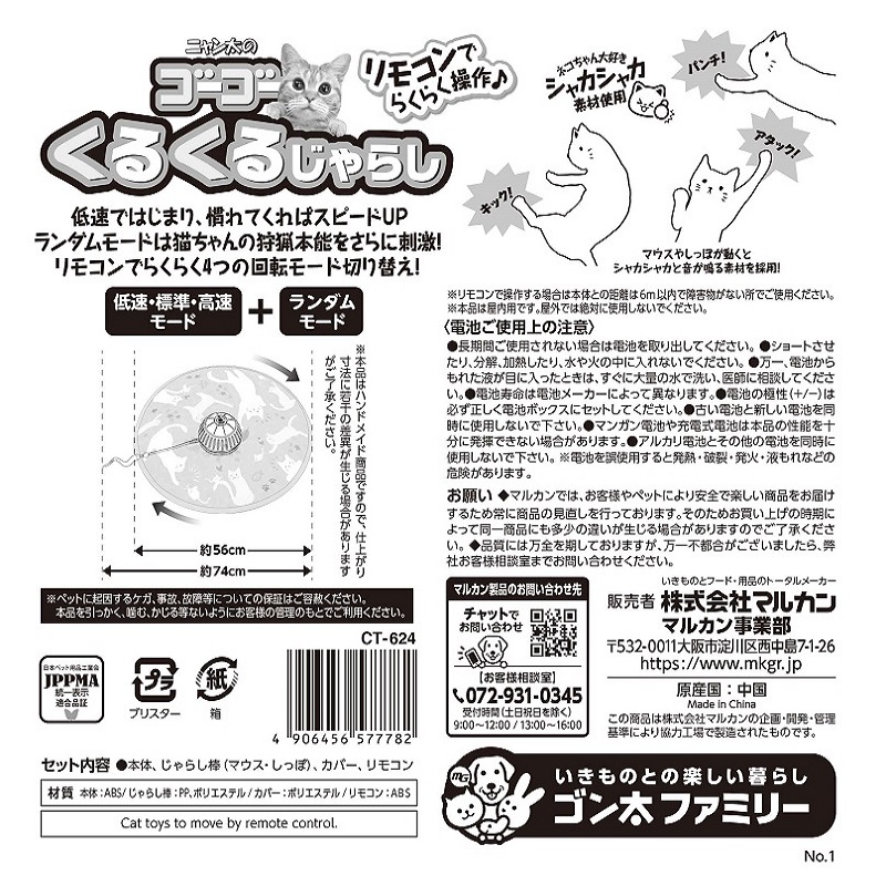 生地:ポリエステル じゃらし棒:PP、ポリエステル カバー:ポリエステル リモコン:ABS