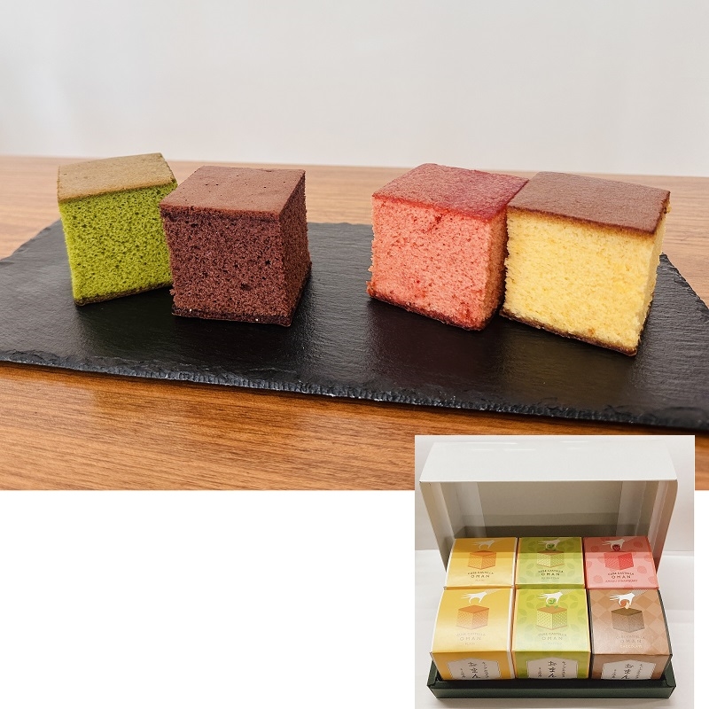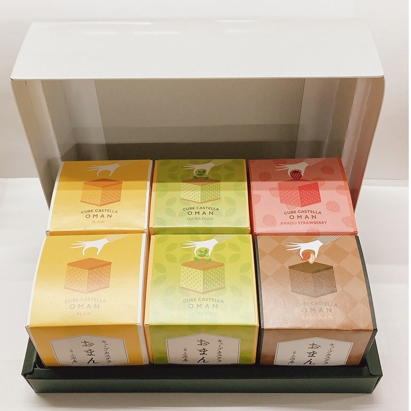 - キューブカステラおまんプレーン×2、 抹茶×2、ショコラ×1、いちご×1