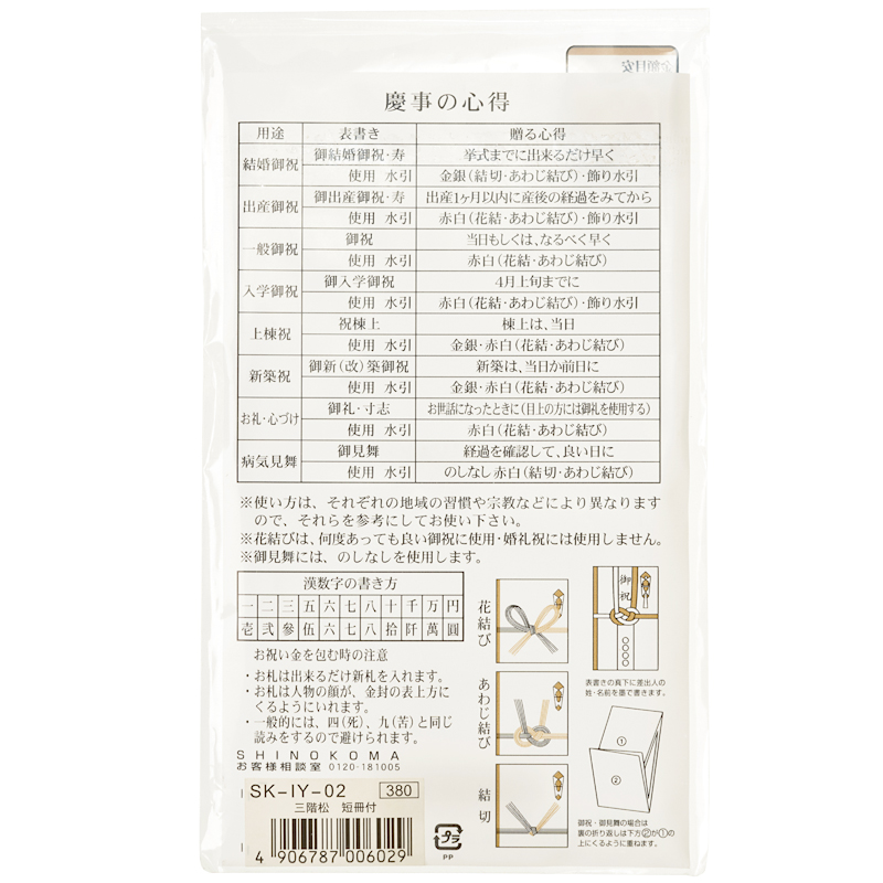 短冊3枚(寿・御結婚御祝・いつまでもお幸せに)と中袋が付いていますので、お祝いごと全般にご利用いただけます。