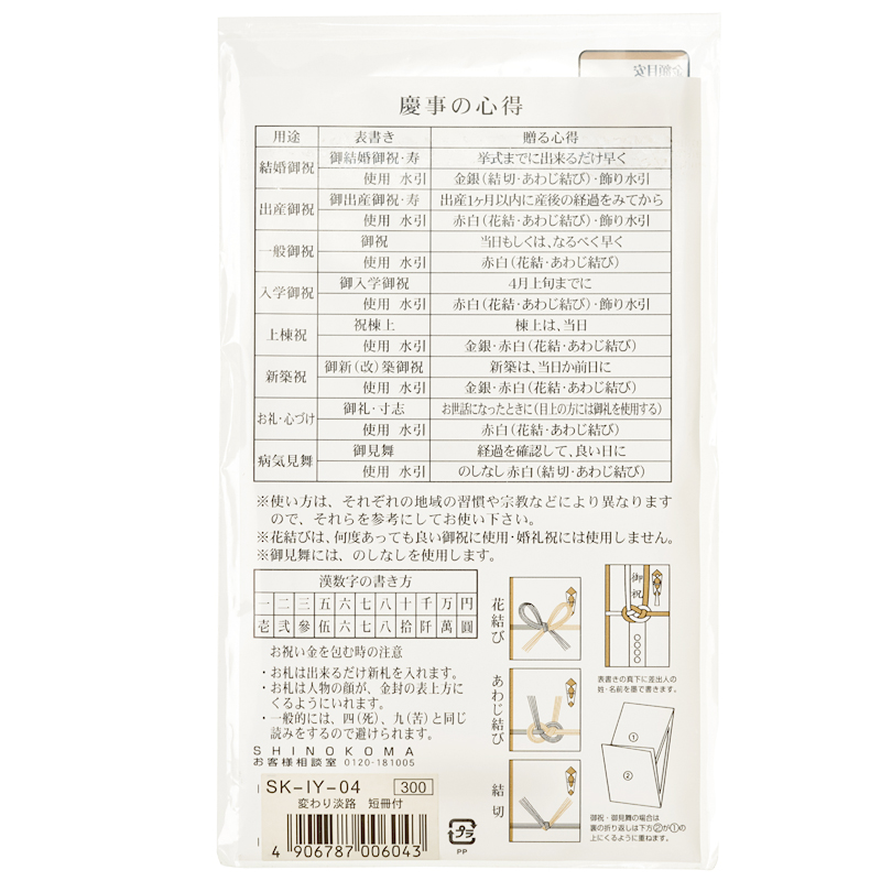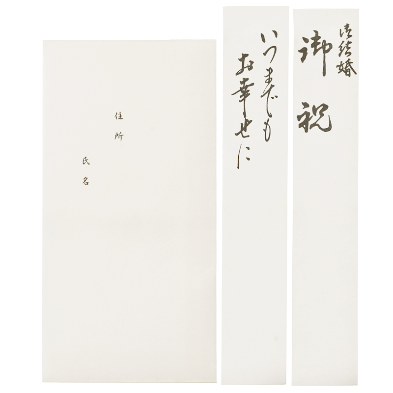 短冊3枚(寿・御結婚御祝・いつまでもお幸せに)と中袋が付いていますので、お祝いごと全般に使用できます。