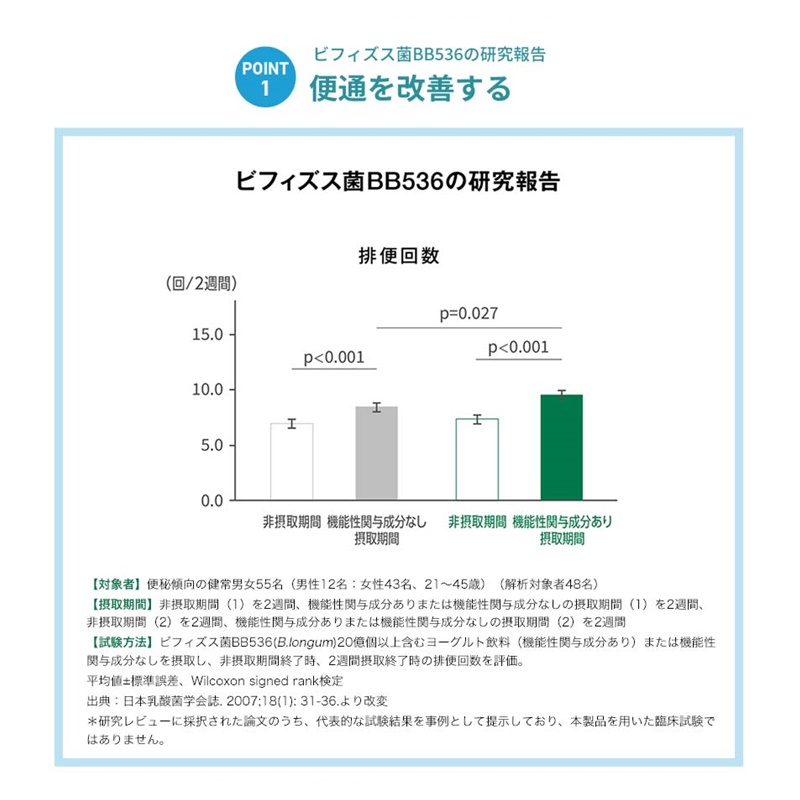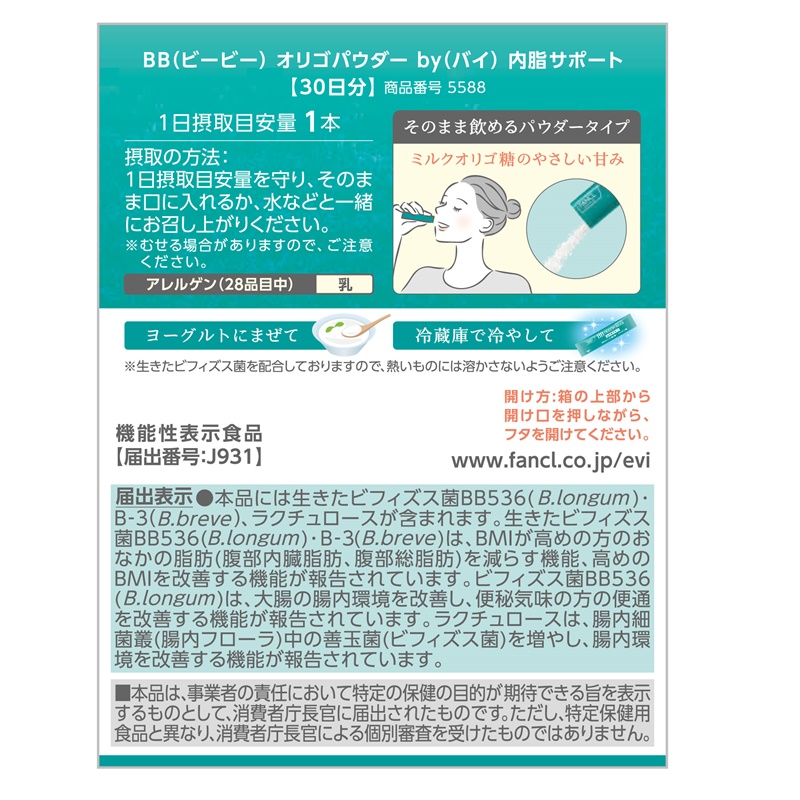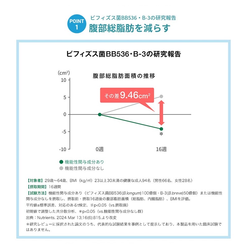 「内脂サポート」にも配合されている、高めのBMIの方のおなかの脂肪を減らすビフィズス菌BB536・B-3に加えて、ビフィ