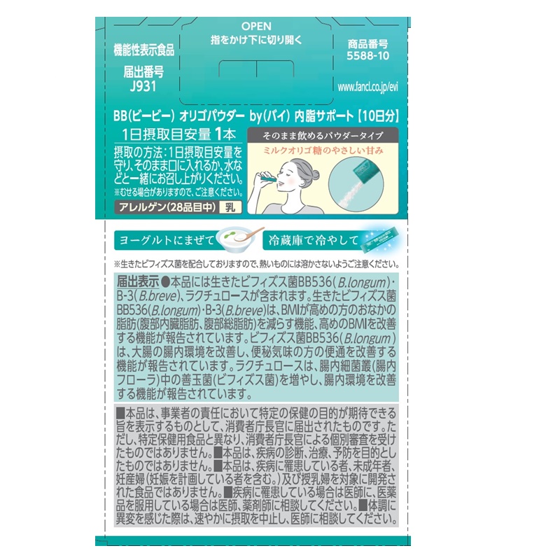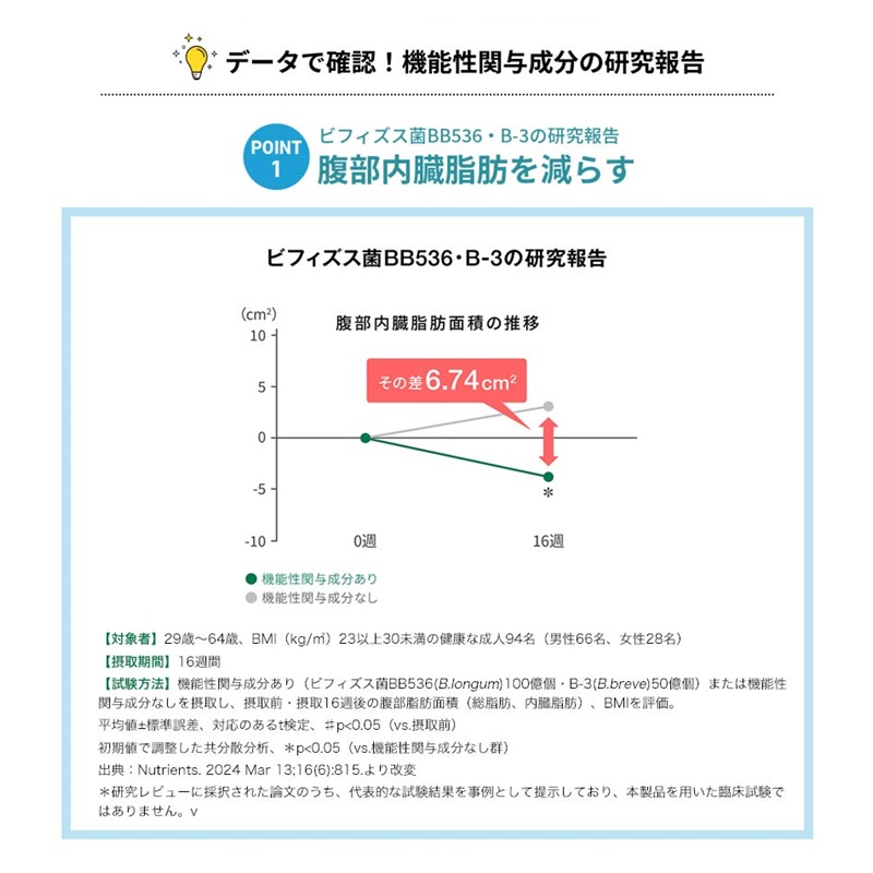 「内脂サポート」にも配合されている、高めのBMIの方のおなかの脂肪を減らすビフィズス菌BB536・B-3に加えて、ビフィ