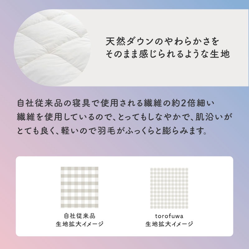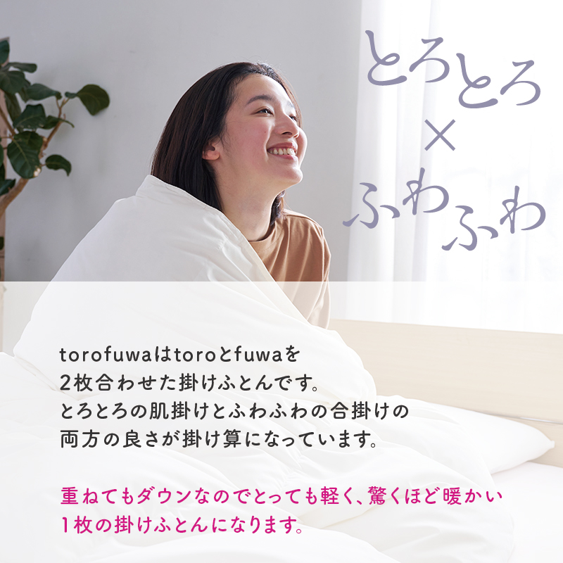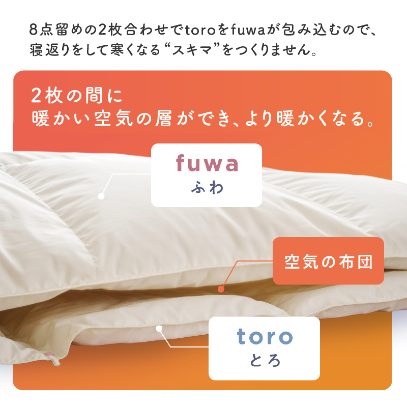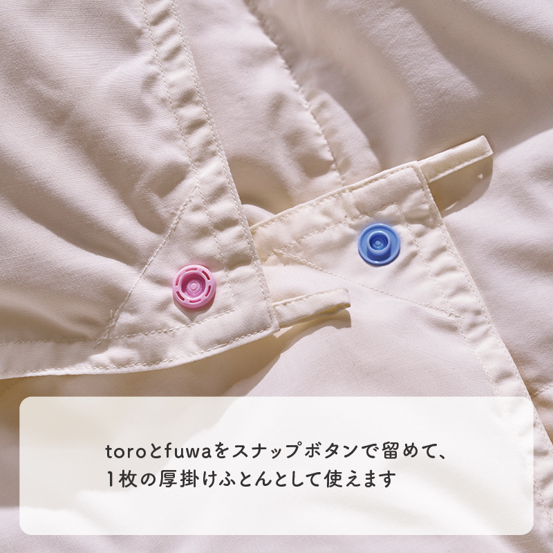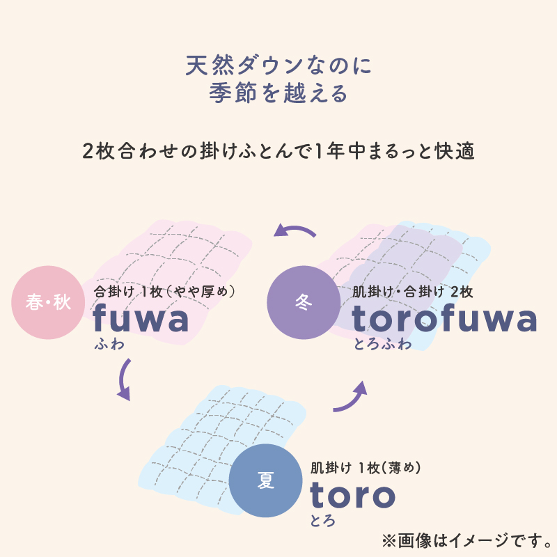 toro(肌掛け)とfuwa(合掛け)の2枚合わせの羽毛掛けふとんで、組み合わせてオールシーズン使えます。