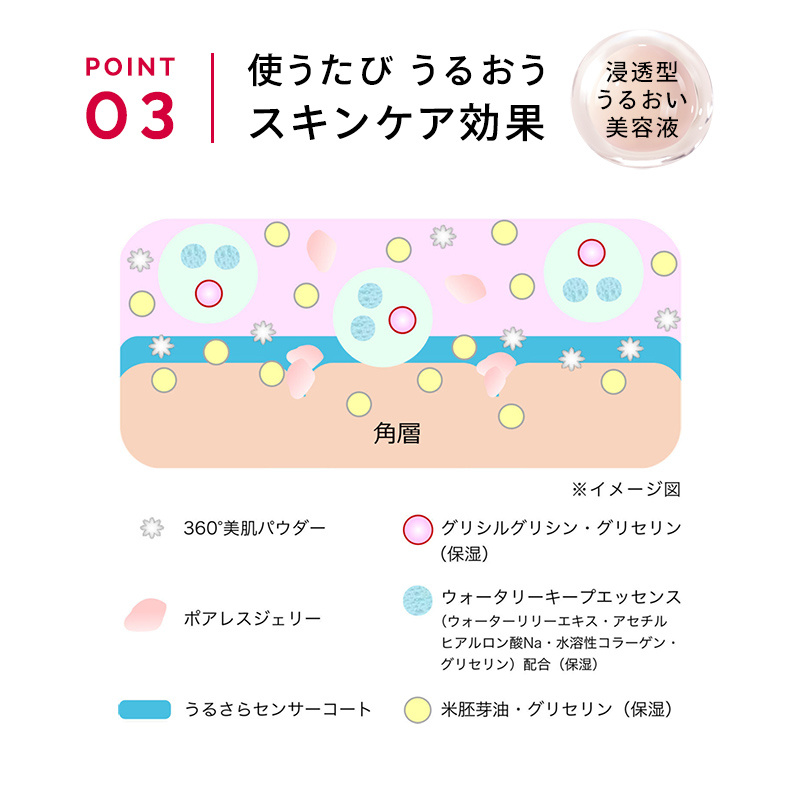 皮脂・水分量をコントロールするうるさらセンサーコート配合。 毛穴補正効果。浸透型うるおい美容液配合。