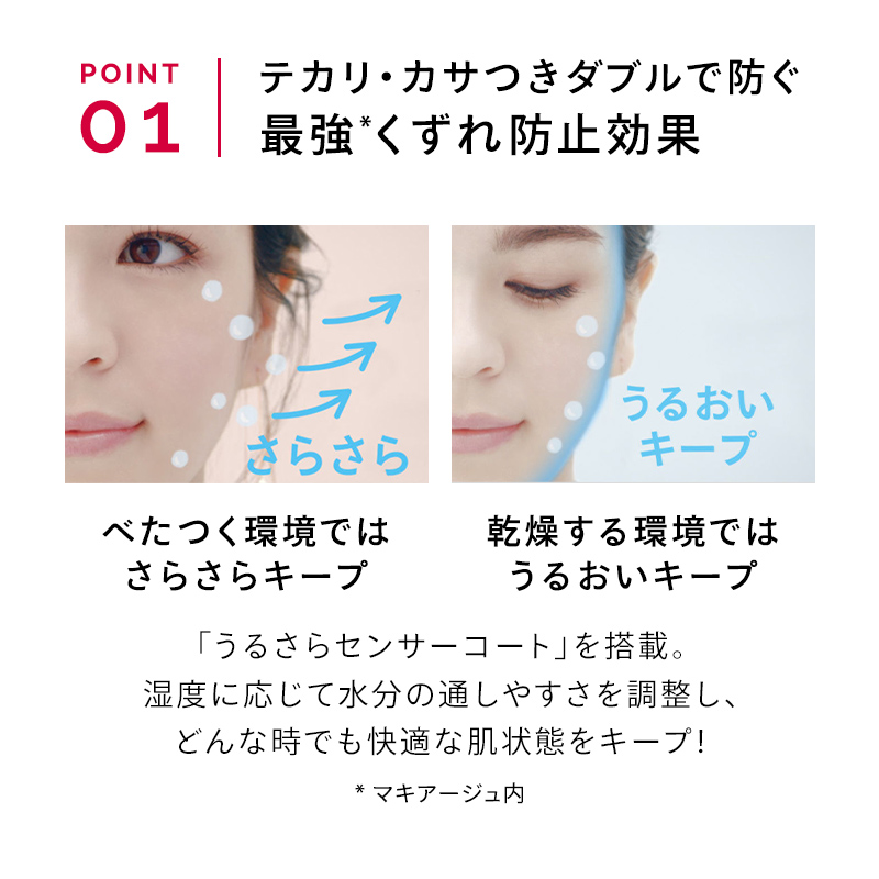皮脂・水分量をコントロールするうるさらセンサーコート配合。 毛穴補正効果。浸透型うるおい美容液配合。