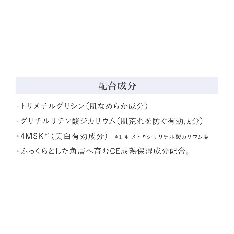 4-メトキシサリチル酸カリウム塩*、グリチルリチン酸ジカリウム*、トリメチルグリシン、アセチル化ヒアルロン酸ナトリウム、