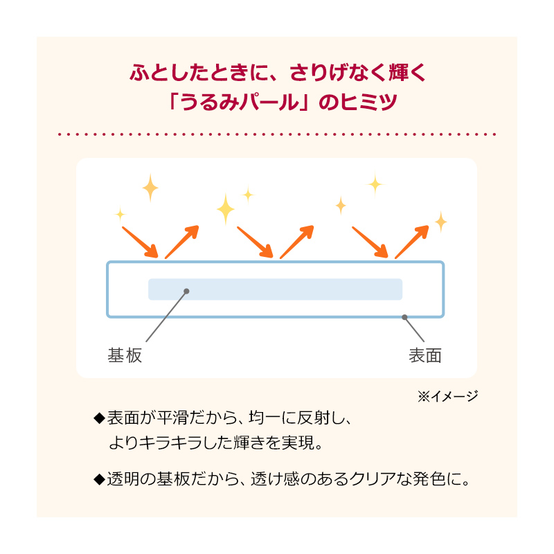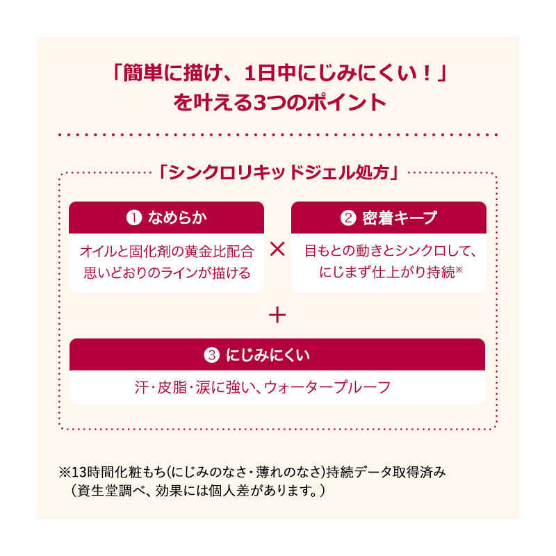 なめらかな描き心地で、描いた瞬間まぶたに密着し、仕上がりを長時間*キープします。 うるみパール入り。