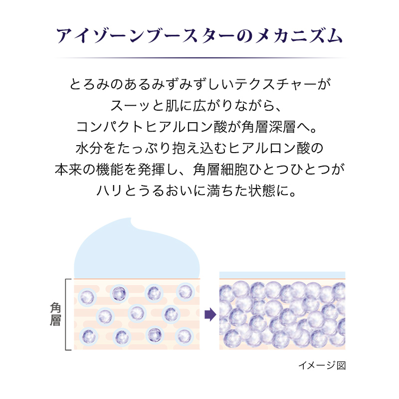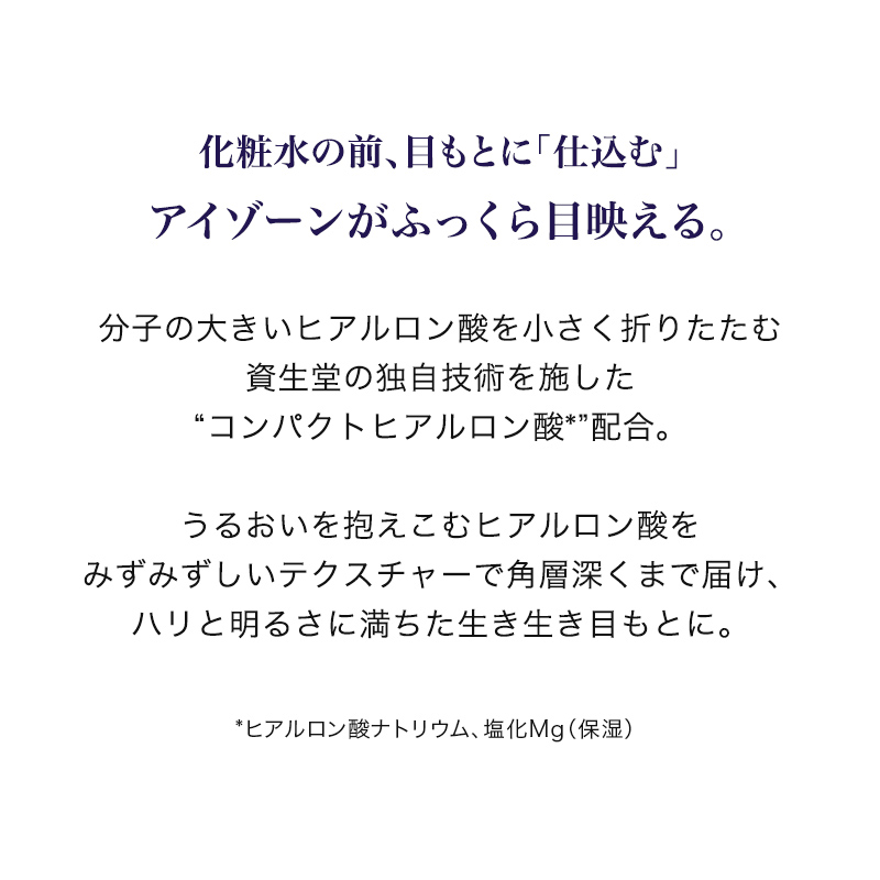 小さく折り畳むという技術を施した「コンパクトヒアルロン酸*」配合で、生き生きとしたハリと明るさのある目もとへ。