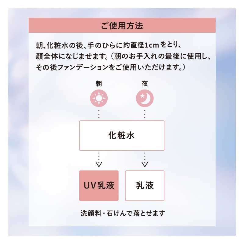 肌にすばやくなじみ、みずみずしい使い心地。 乾燥による小ジワを目立たなくします*。 洗顔料・石けんで落とせます。