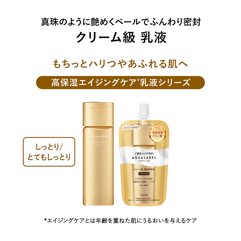 真珠のように艶めくベールで、ふんわり密封。もちっとハリつや溢れる肌へ、クリーム級 高保湿エイジングケア*乳液。