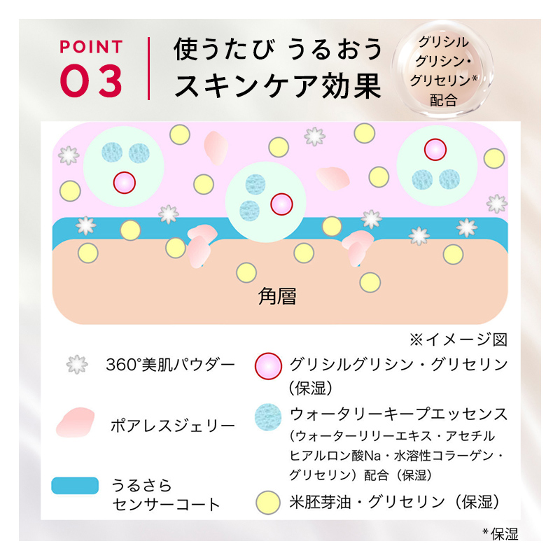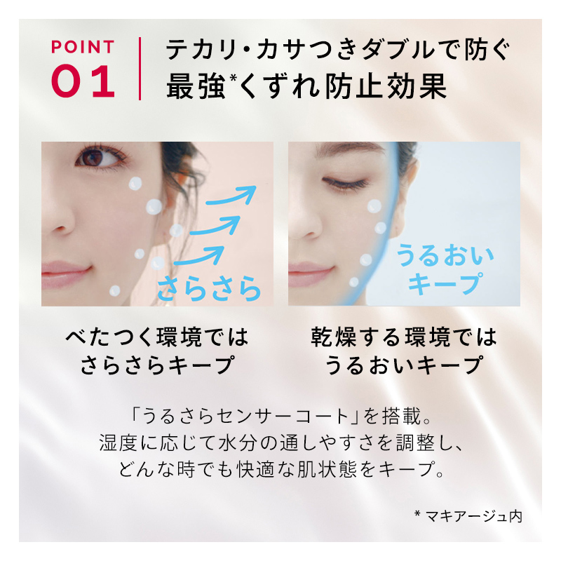 皮脂・水分量をコントロールするうるさらセンサーコート配合。 毛穴補正効果。浸透型うるおい美容液配合。