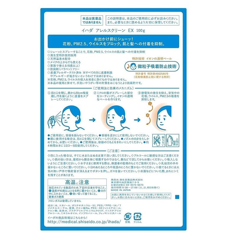 シューッとスプレーすることで、花粉・PM2.5・ウイルスの肌と髪への付着を抑制するスプレータイプの花粉防御剤。