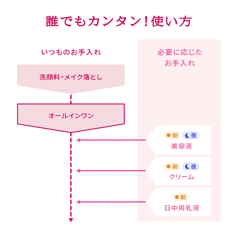 7つの機能(化粧水・乳液・美容液・マッサージ・クリーム・パック・化粧下地)がひとつになった大人のオールインワン。