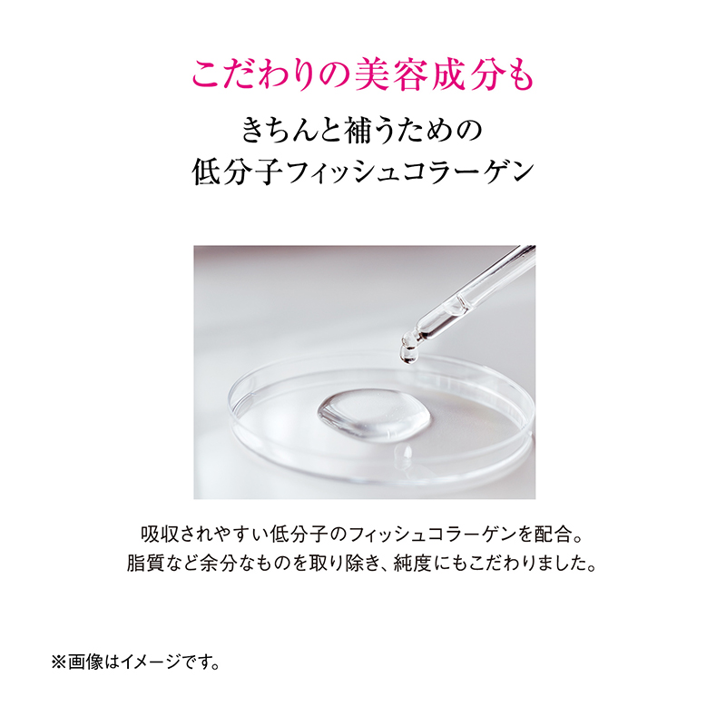 子コラーゲン、ヒアルロン酸、セラミド、ビタミンCを配合。