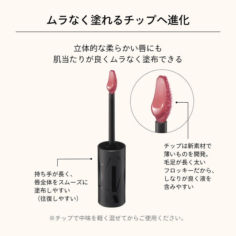 つけたての発色をキープしながら透明度の高いツヤがあふれ出し唇をまるごと包み込む。