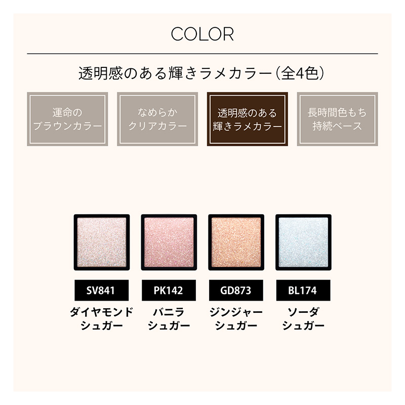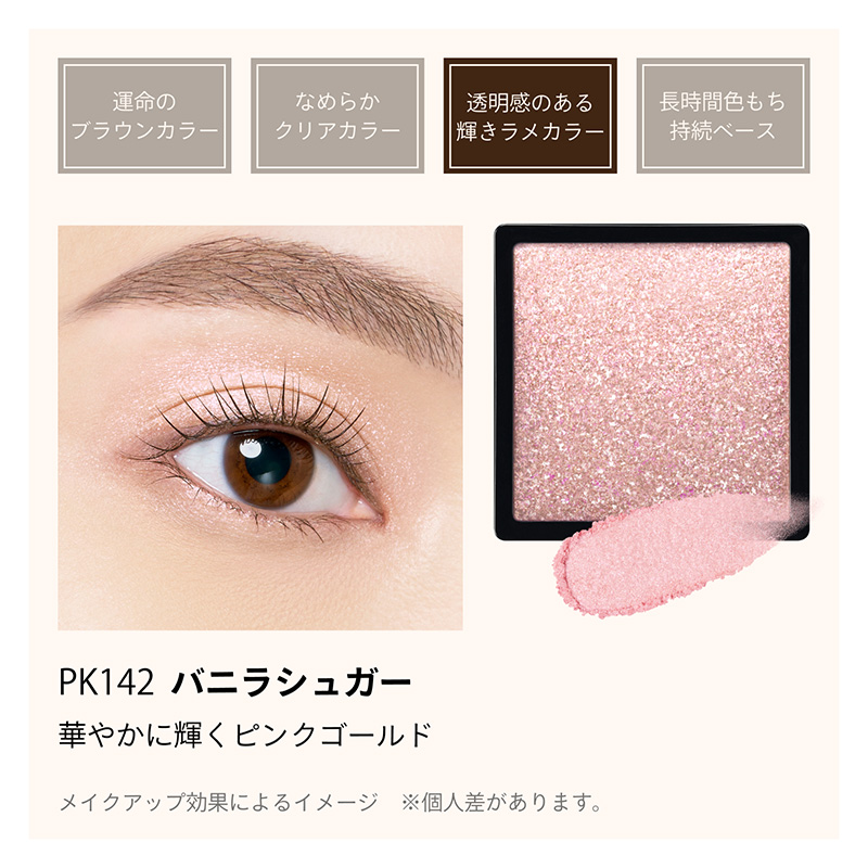 まぶたの中央や涙袋に重ねて、目もとを華やかに彩る きらめきのアクセント。透明感のある輝きラメカラー。