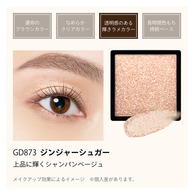 まぶたの中央や涙袋に重ねて、目もとを華やかに彩る きらめきのアクセント。透明感のある輝きラメカラー。