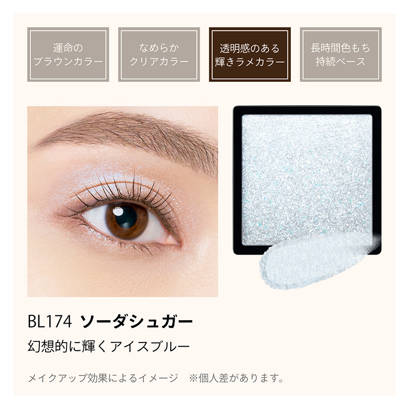 まぶたの中央や涙袋に重ねて、目もとを華やかに彩る きらめきのアクセント。透明感のある輝きラメカラー。