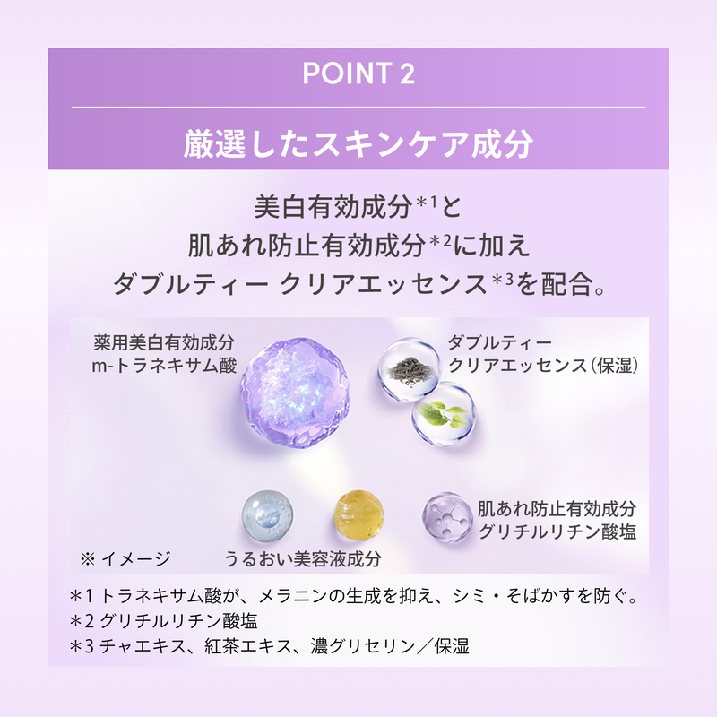 メラニンの生成を抑え、シミ・そばかすを防ぐ薬用美白成分 mートラネキサム酸**配合。