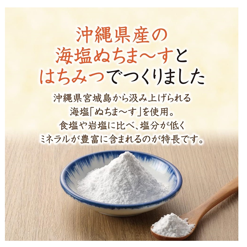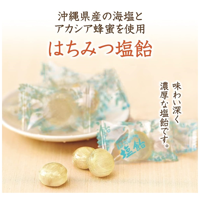 すっきりした塩味と、完熟はちみつの濃厚な甘さが口の中で溶け合うまろやかな味わいキャンディー。